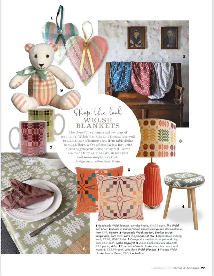November's Issue of Homes & Antiques has a wonderful article by Ellie Tennant - ‘Buyer’s Guide to Welsh Blankets’.